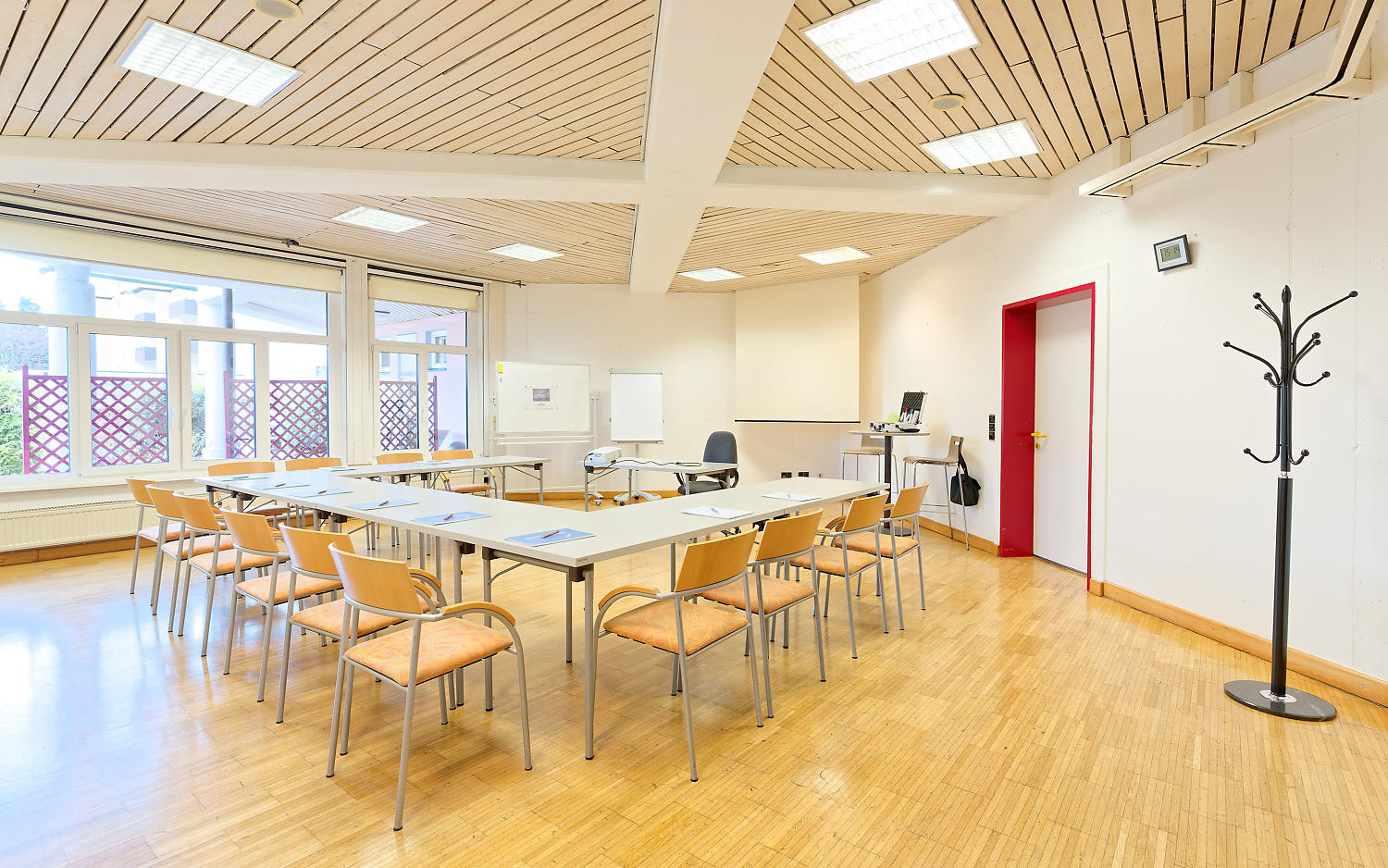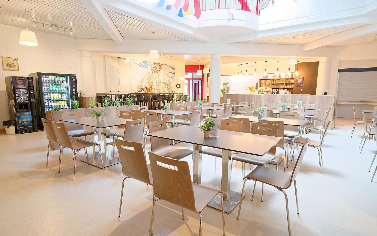 The lobby also welcomes guests with its open and friendly character – the perfect place to arrive and relax. A special highlight is the in-house bouldering hall, offering an attractive activity for more active guests. The spacious dining and function hall further complements the facilities and provides plenty of room for groups.