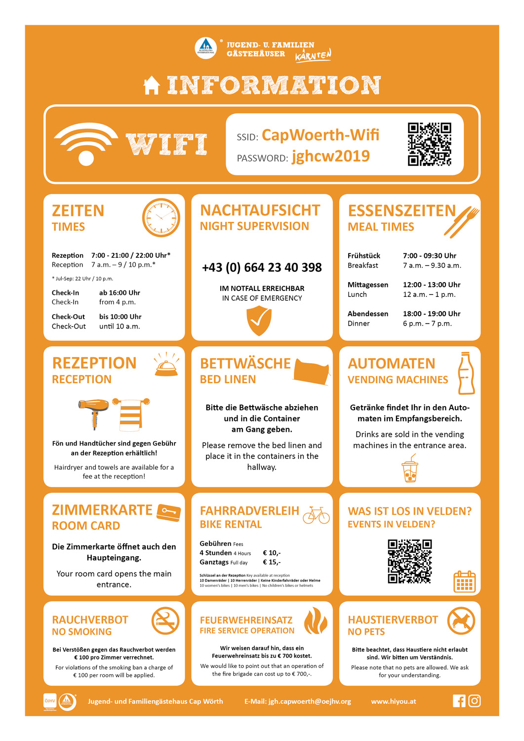 Damit Sie sich bei uns noch besser zurechtfinden, stehen ab sofort in unseren Jugend- und Familiengästehäusern in Klagenfurt, Cap Wörth, Villach und Heiligenblut neue, mehrsprachige Informationsplakate zur Verfügung.