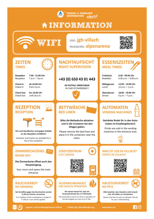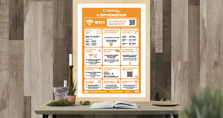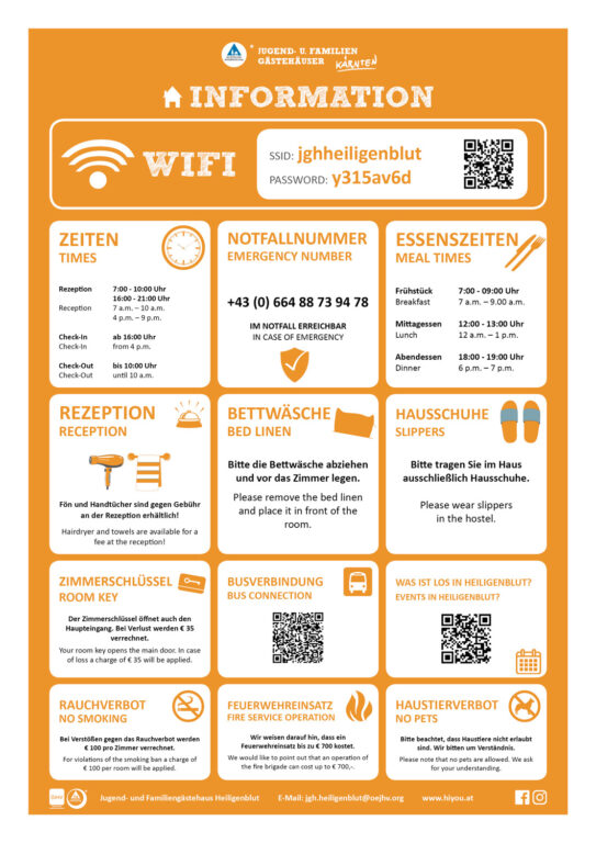 Diese enthalten kompakt und übersichtlich alle wichtigen Infos für Ihren Aufenthalt – von Check-In-Zeiten über WLAN-Daten bis hin zu Notfallnummern. Die Plakate sind an zentralen Stellen im Haus gut sichtbar angebracht und erleichtern Gästen wie Gruppenleiter:innen die Orientierung.